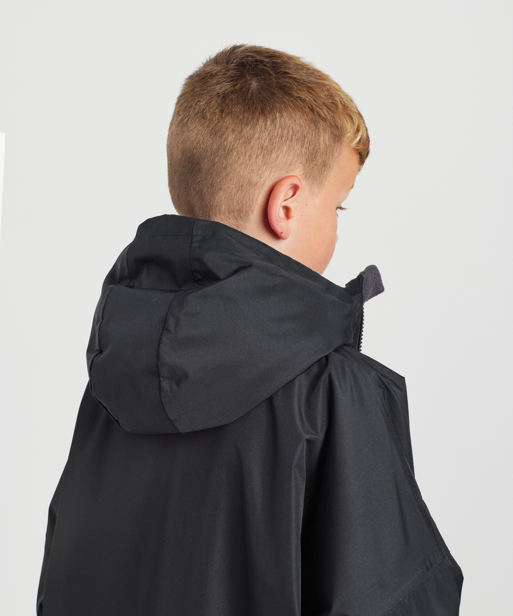 The Kids TriDri® All-seasons waterproof changing robe boasts a waterproof exterior with hood to keep kids dry, as well as adjustable straps to the wrists and chin guard to help lock in heat on windy days.