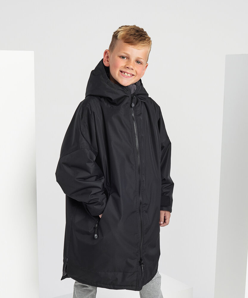 The Kids TriDri® All-seasons waterproof changing robe boasts a waterproof exterior with hood to keep kids dry, as well as adjustable straps to the wrists and chin guard to help lock in heat on windy days.